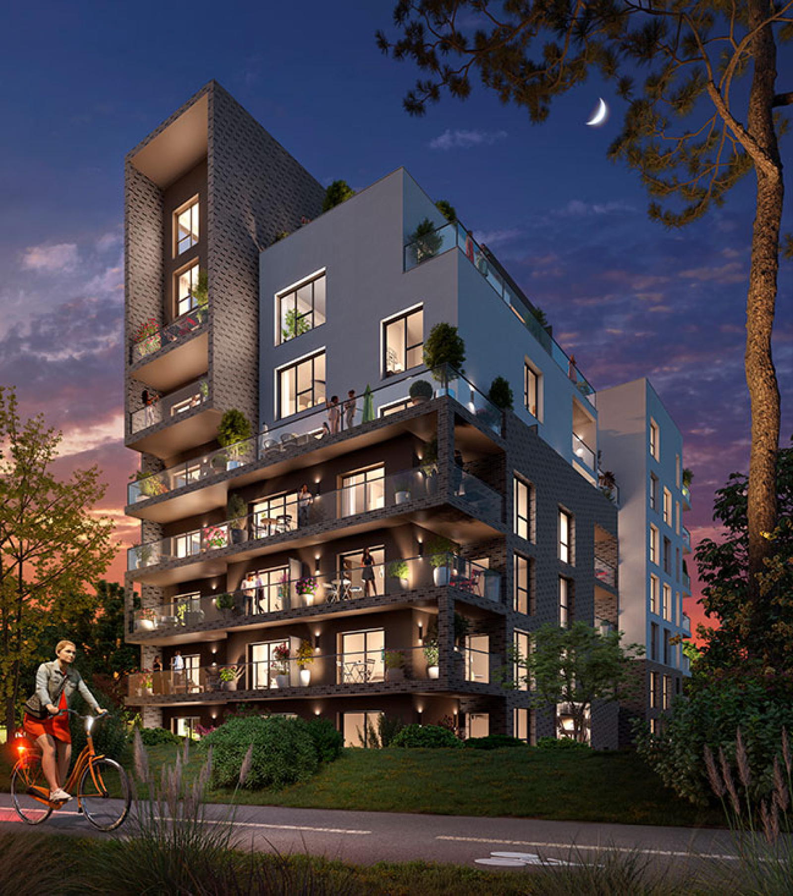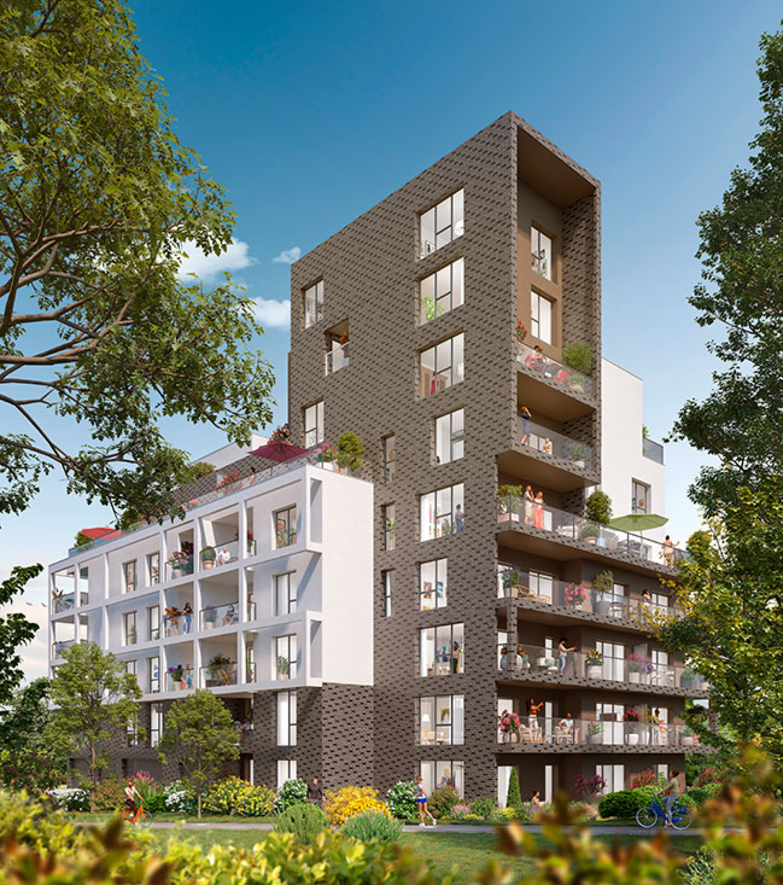 Les prestations : chaque appartement dispose de grandes baies vitrées pour offrir un maximum de clarté. Dotés de vastes terrasses, la résidence présente un dessin harmonieux : un travail de lignes et de textures entre le blanc et la brique, des matériaux épurés, pensés pour se fondre dans l’environnement naturel avoisinant.
