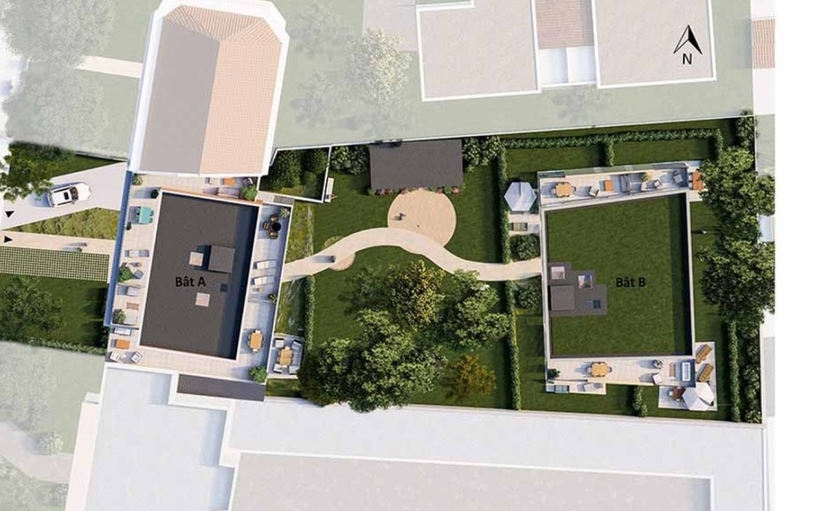 La résidence : Deux bâtiments de seulement 38 appartements du studio au 4 pièces pour cette résidence contemporaine qui s’intègre parfaitement dans son environnement…