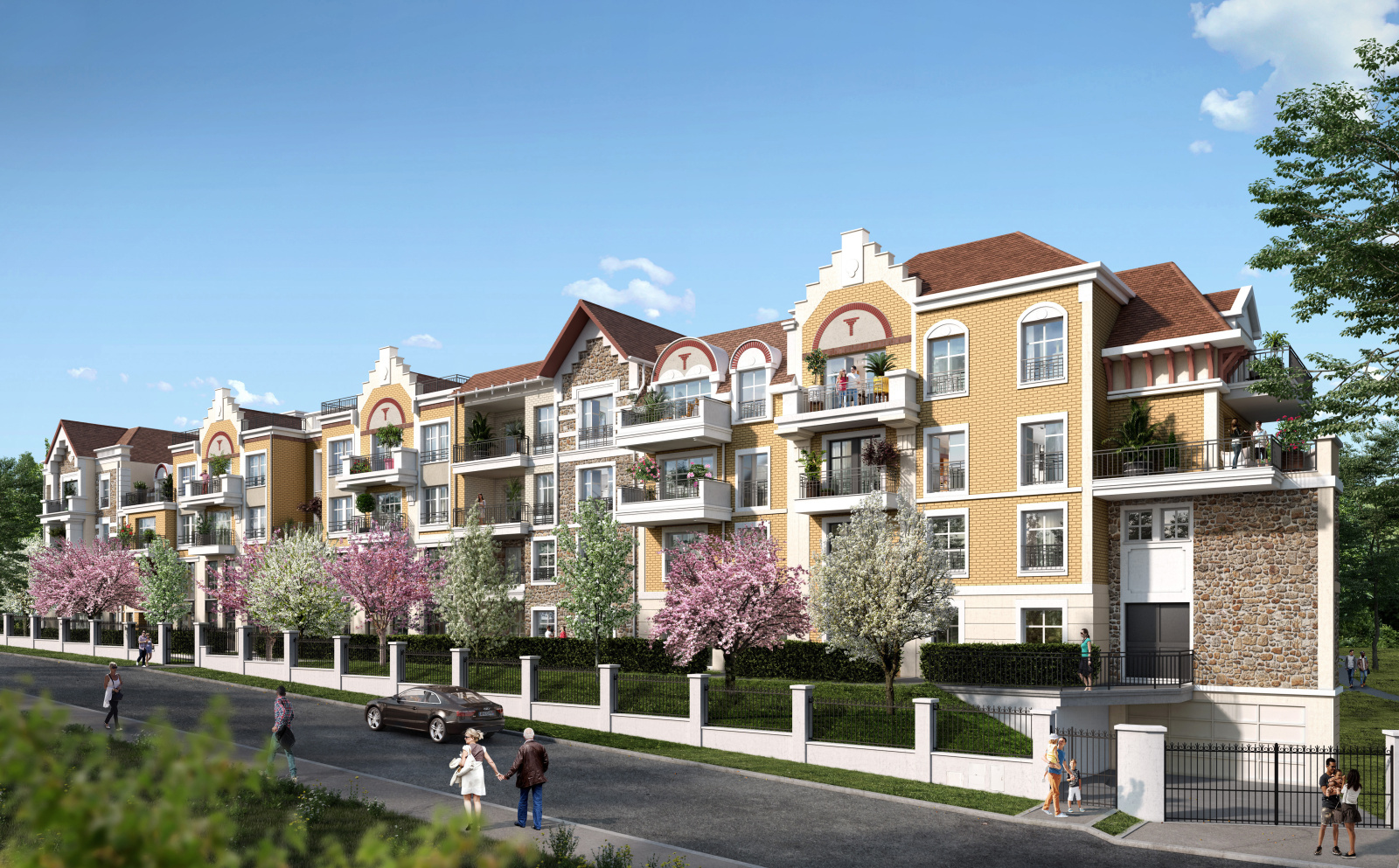 La résidence : Développés sur 3 ou 4 étages, les appartements sont desservis par 4 halls organisés autour d’un grand jardin intérieur, accessibles chacun par un même porche traversant, revêtu de pierre de noyant…